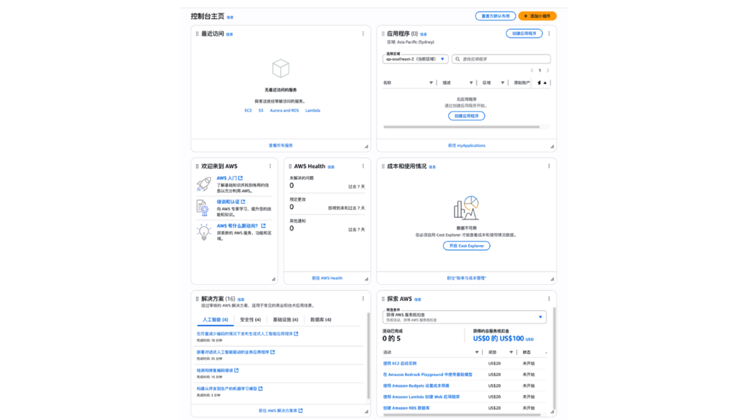 全部打开其中,右下角“探索 AWS ”部分,显示出完成活动可获得总服务抵扣金 100 美元的活动清单。如下图。