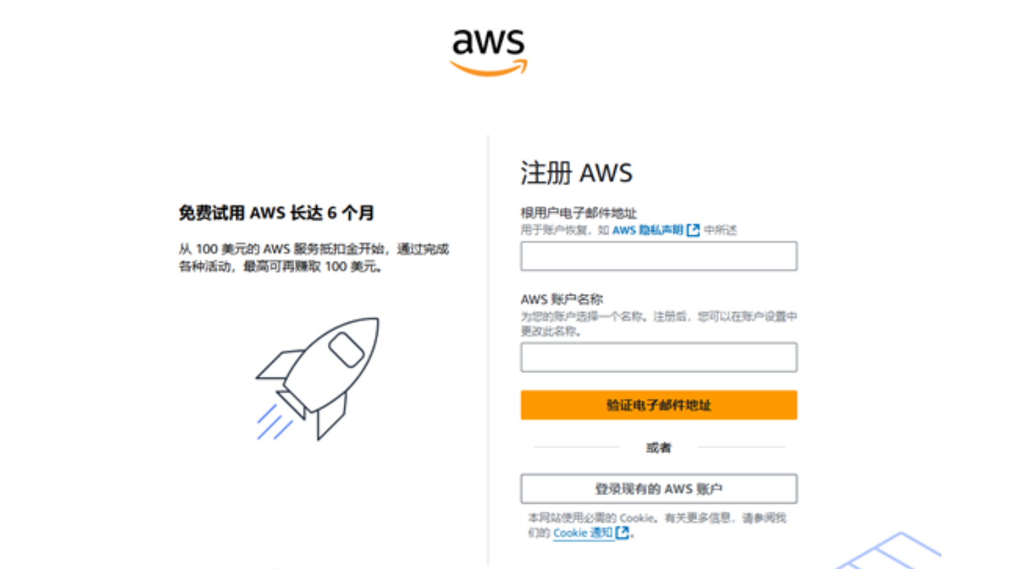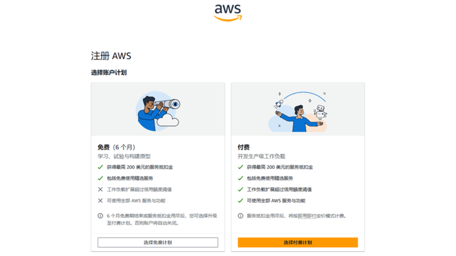 - 免费计划账户:您可以在注册后的最多 6 个月内,在免费计划下使用 AWS 服务,期间无需支付费用。