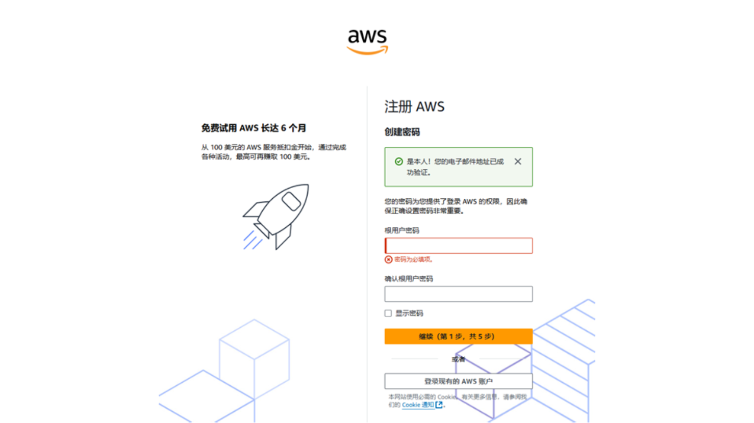 从邮箱得到验证码(6 位数字),输入后点击验证。继续下一步。验证码通过后,要求输入根用户密码,和确认密码。然后点击继续。