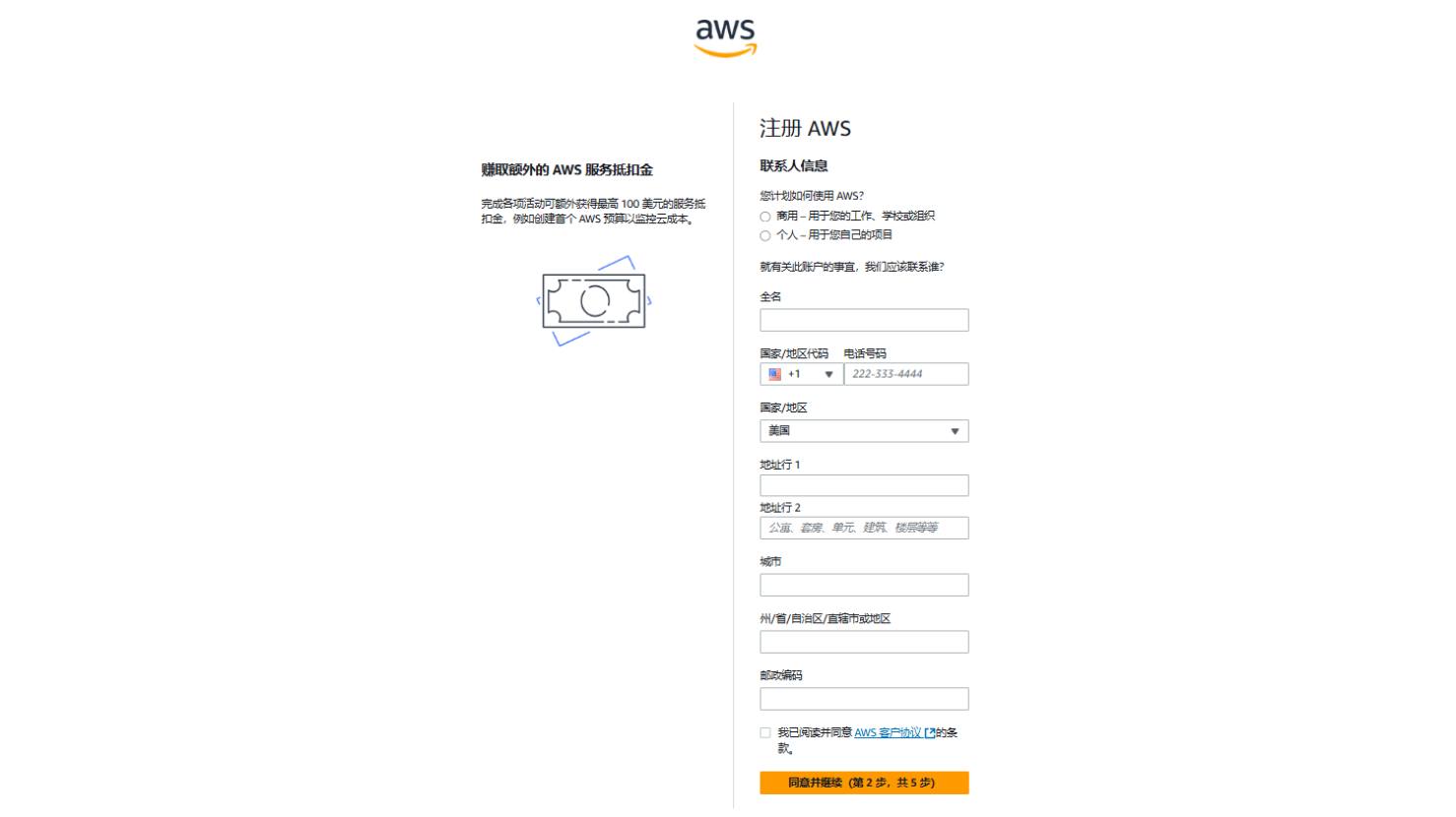 需要注册个人心,包括联系人信息,姓名,国家地区,地址,城市、省/自治区/直辖市及邮政编码,填好后点击“同意并继续(第 2 步,共 5 步)继续下一步。