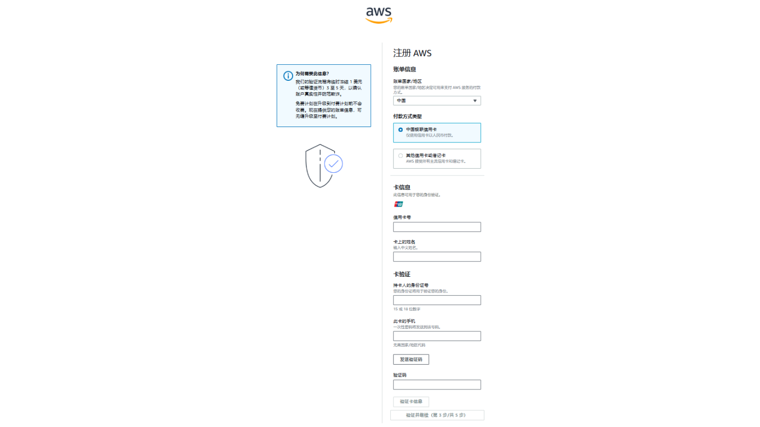 新用户须选择“付款方式类型“,填写“信用卡号”,并进行卡验证,完成后点击“验证并继续(第 3 步/共 5 步)继续下一步。