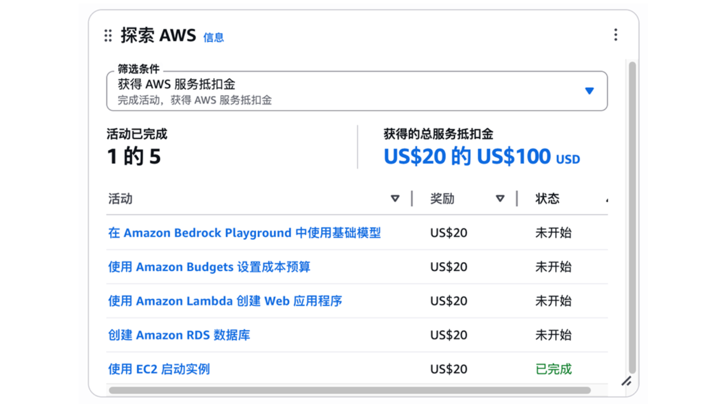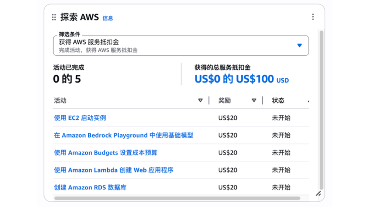 其中,右下角“探索 AWS”部分,显示出完成活动可获得总服务抵扣金 100 美元的活动清单。如下图。