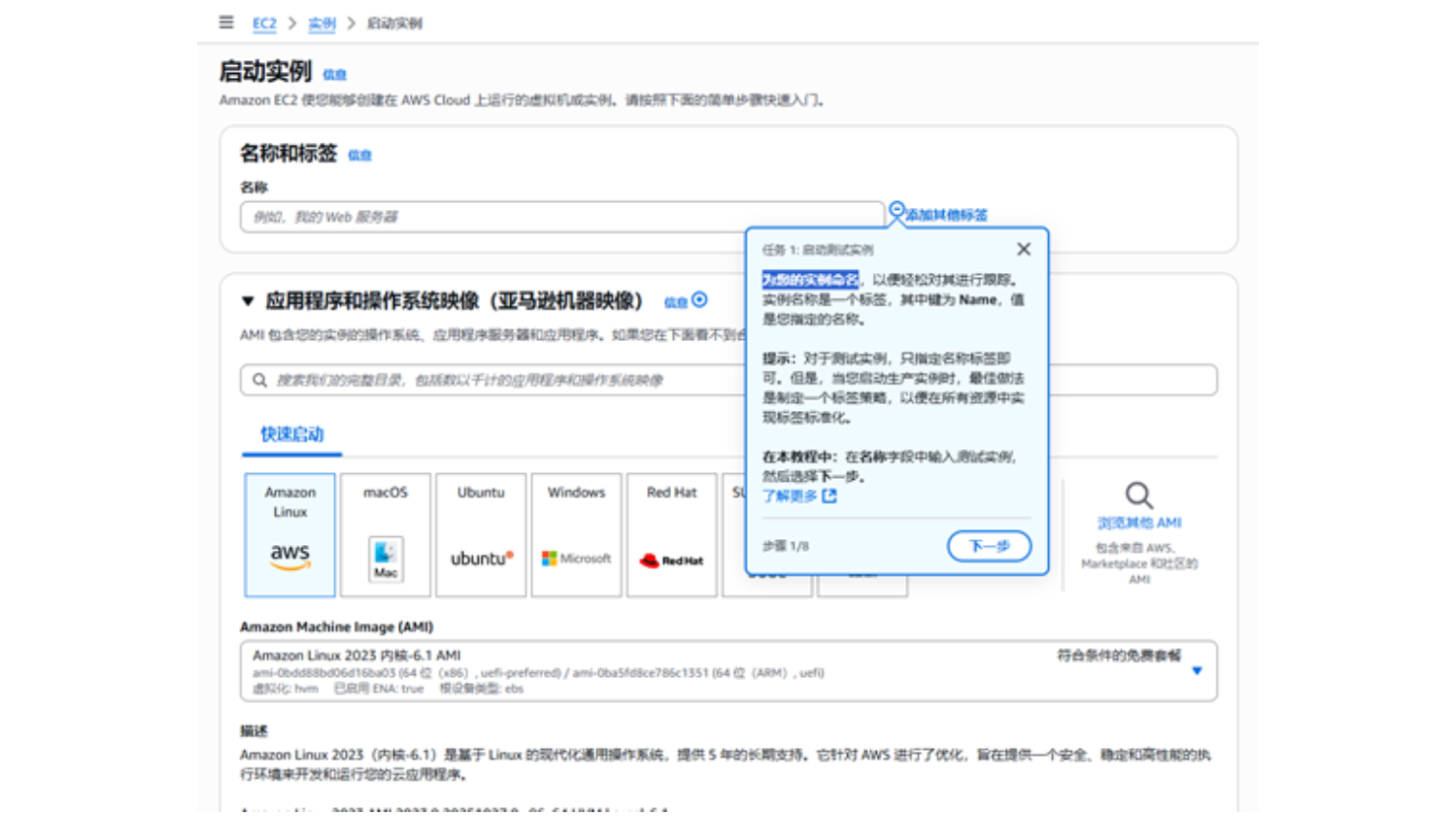 例如,对话框提示“为您的实例命名”,是个简易教程,分 8 个步骤,分别介绍如何操作。
