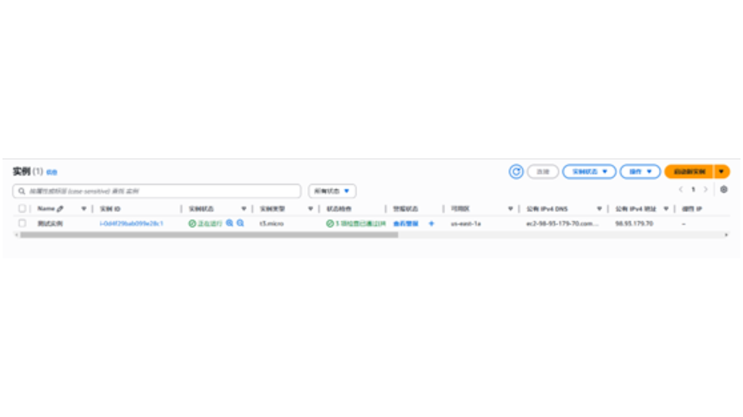 在创建成功提示页面,我们可以点击查看所有实例按钮,我们可以看到所有已创建的 EC2 实例,如下图。