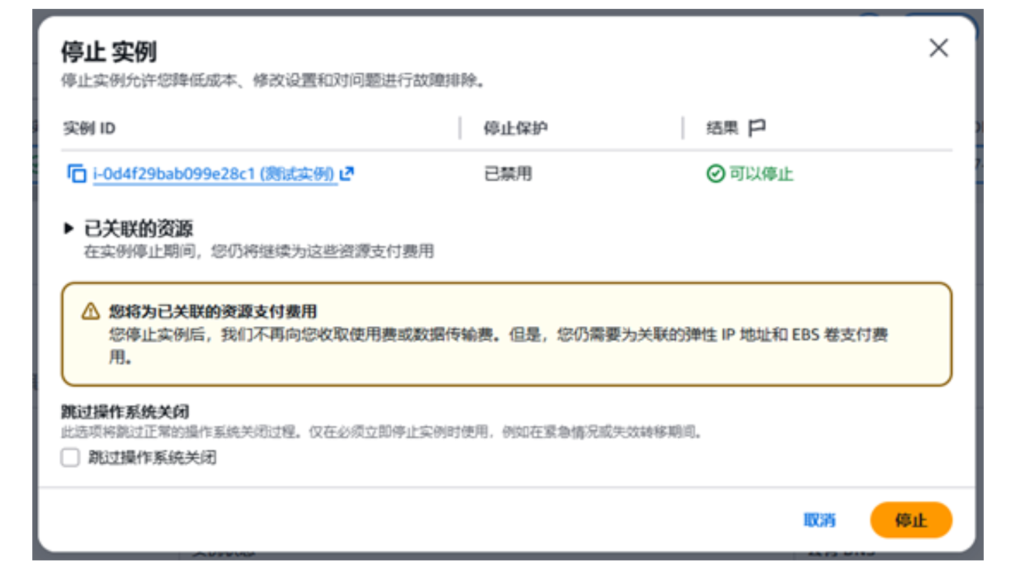 点击停止实例后,会出现对话框来确认是否停止实例,点击停止即可,如下图所示: