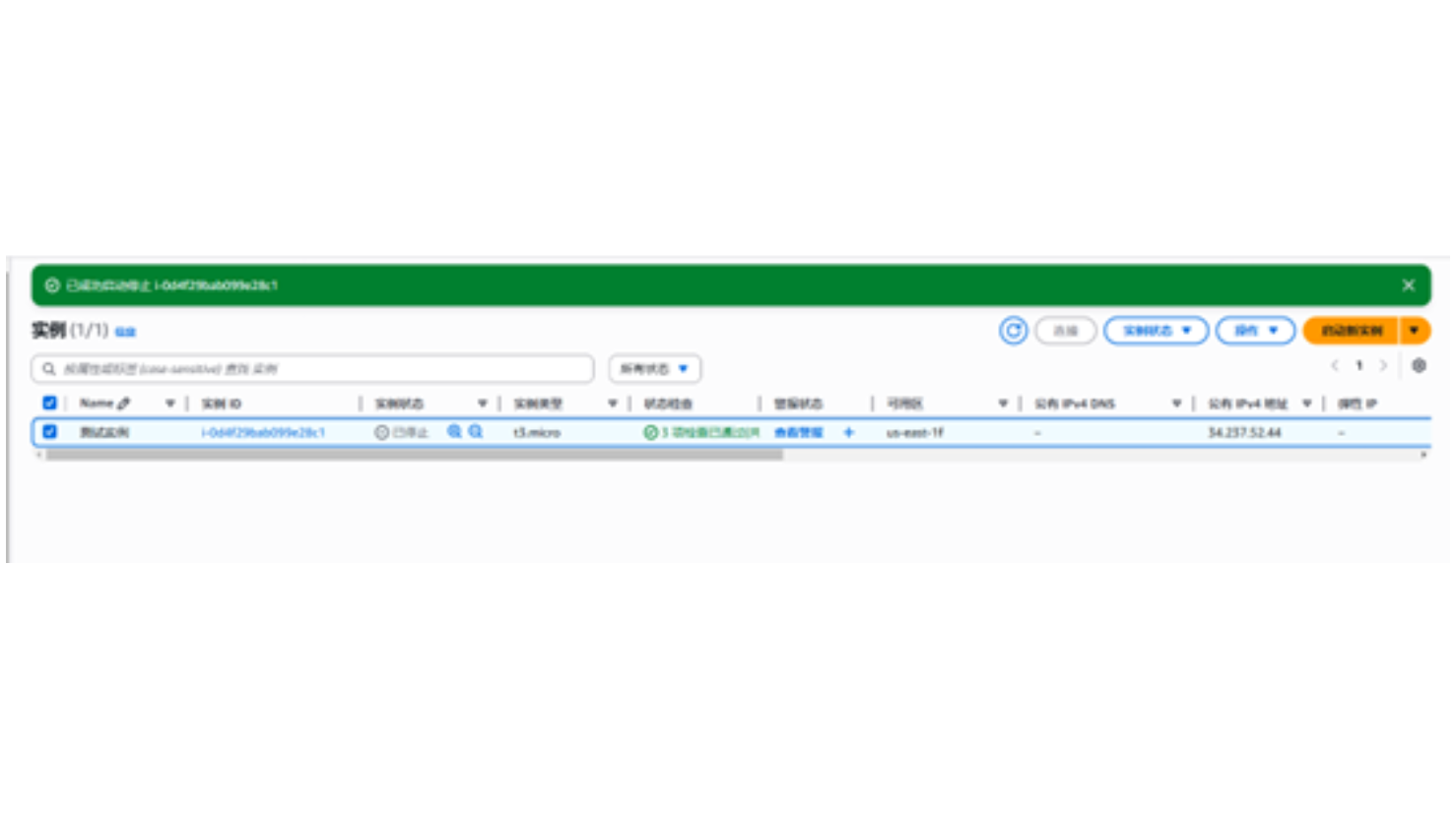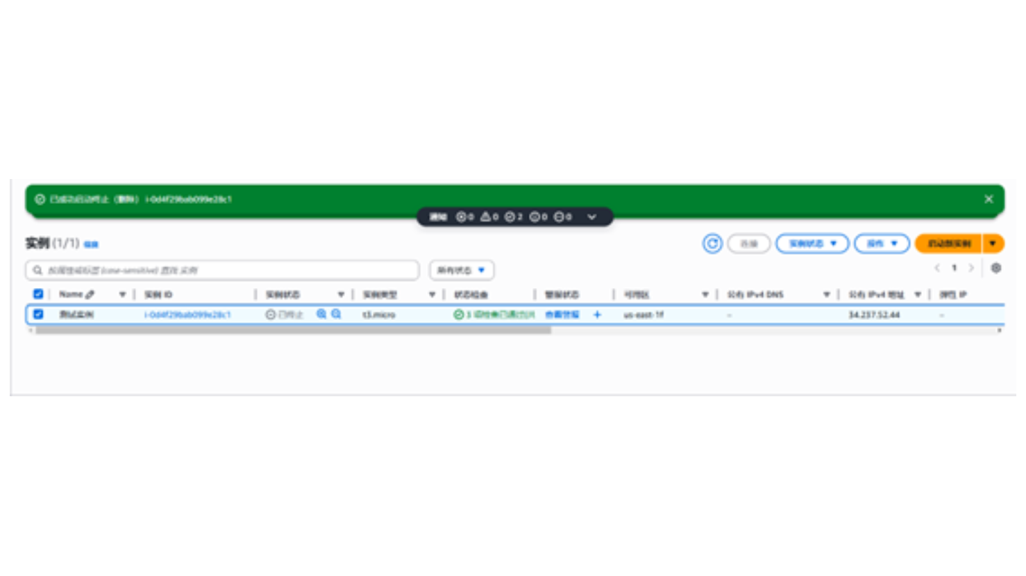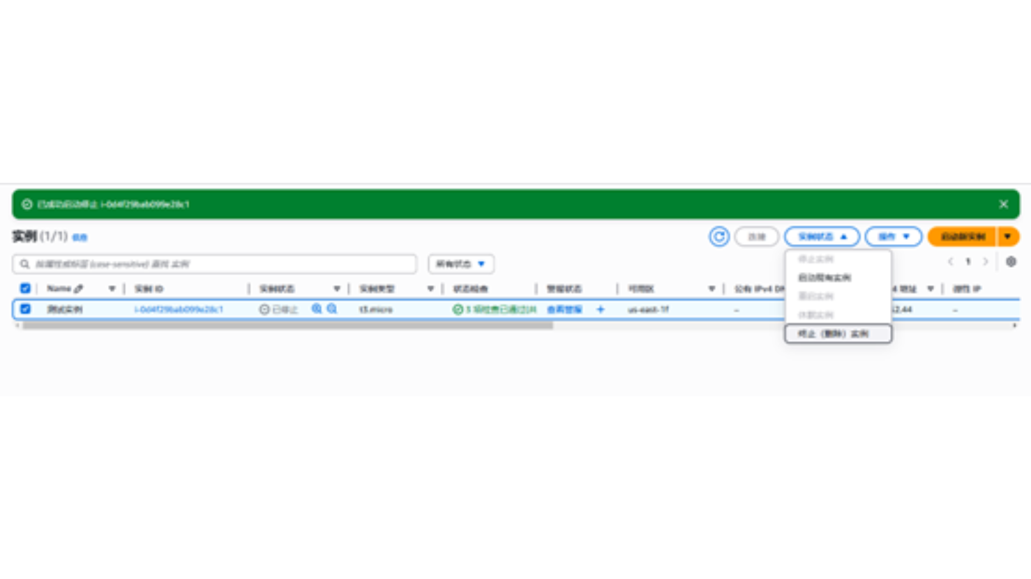 点击“停止”按钮后,页面更新为“已成功启动停止实例…”,实例的状态也已更新为已停止,如下图所示: