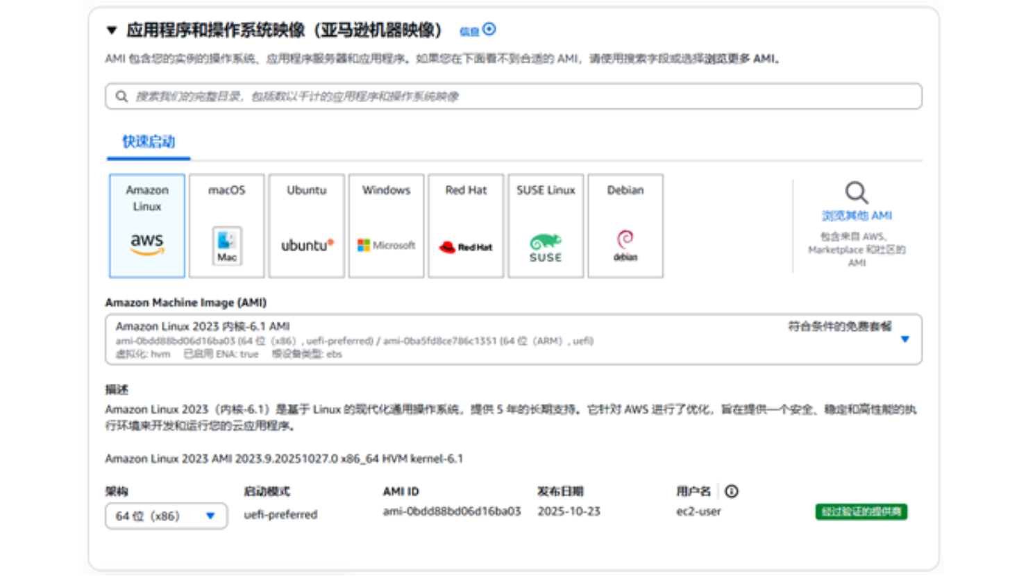 这里我们可以看到,其默认的 Amazon Linux 2023 作为操作系统,其内核架构为 64 位,最新发布日期为 2025 年 7 月 19 日,也是经过验证的提供商。