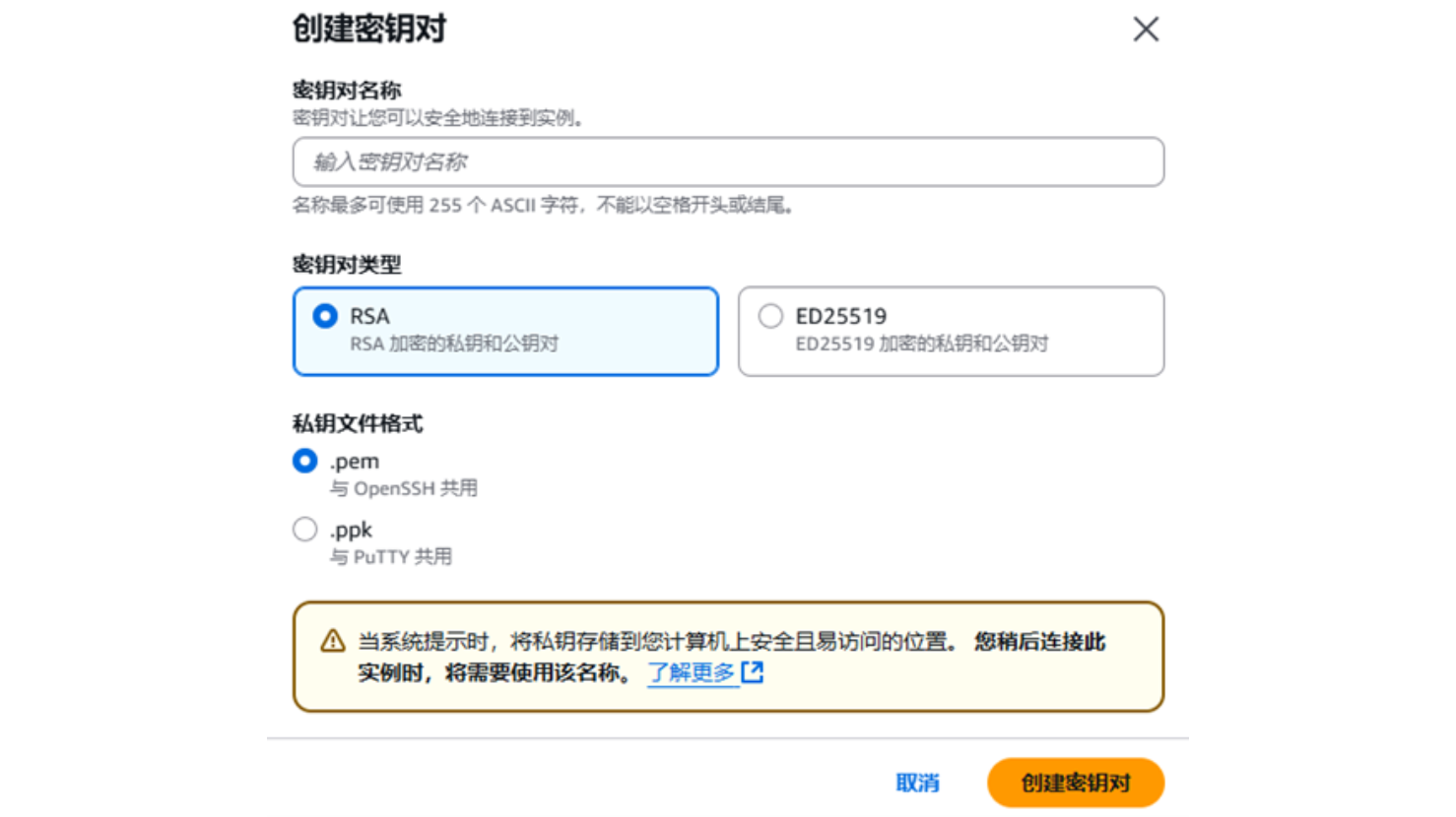 *注意:密钥对名称名称最多可使用 255 个 ASCII 字符,不能以空格开头或结尾。