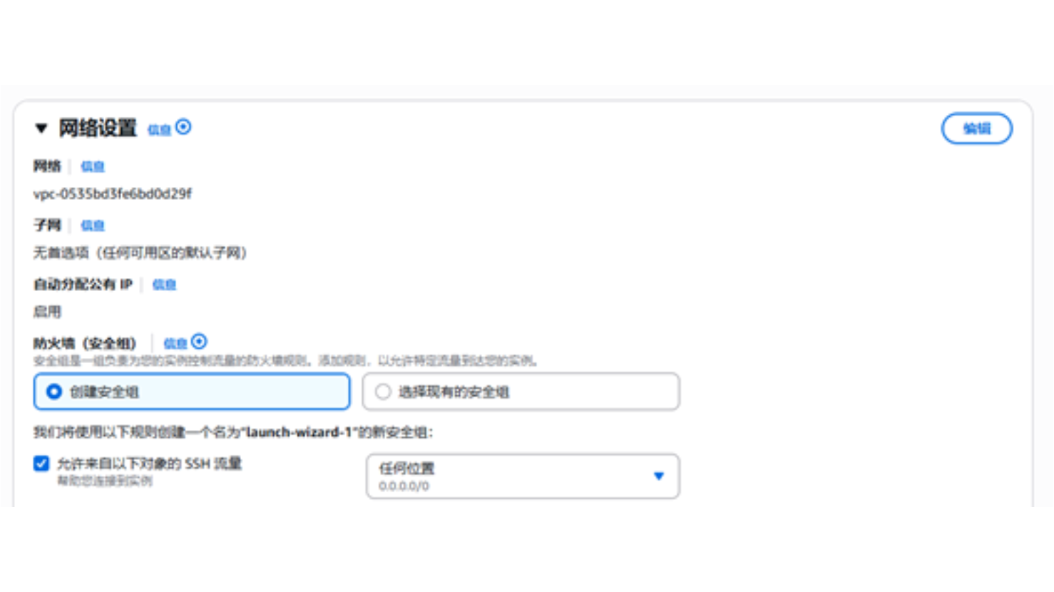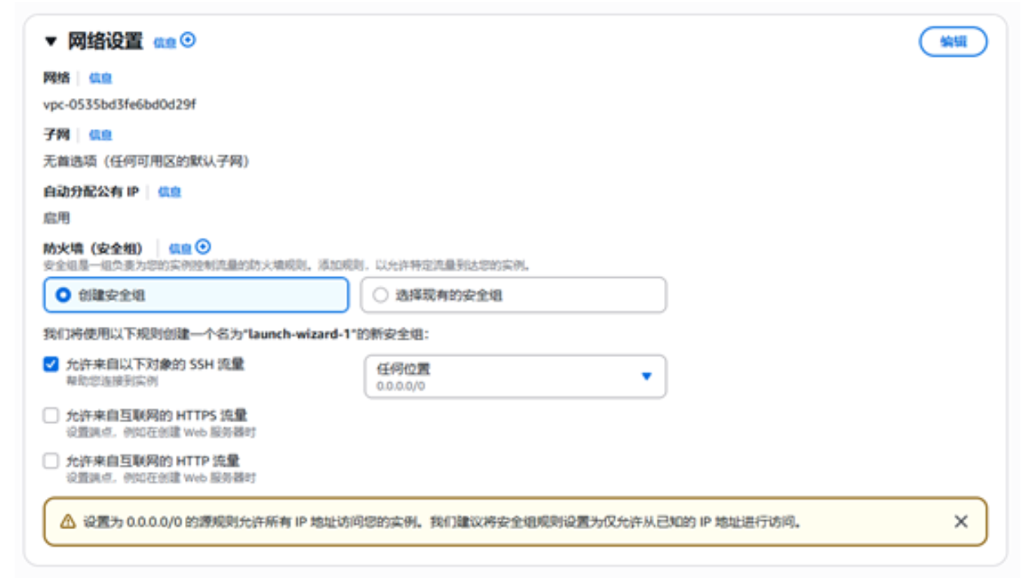 本次活动,将为测试实例创建安全组,以允许来自任何未知的流量。以下图中复选项包含“允许来自以下对象的 SSH 流量(任何位置 0.0.0.0/0)。