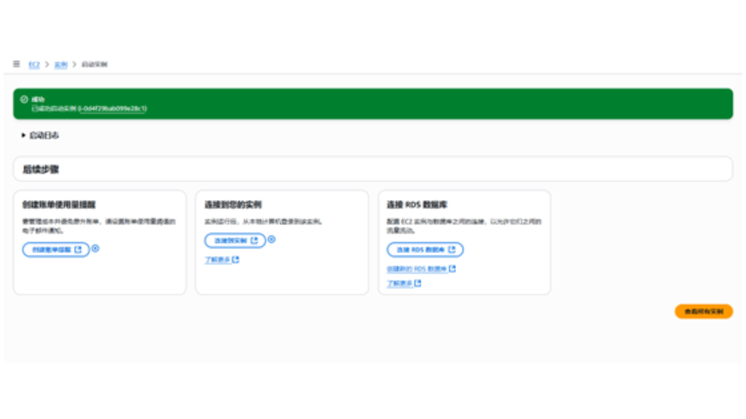 点击“启动实例”后,AWS 迅速启动该实例,稍微等待下,当实例创建成功后,页面会出现成功创建的提示,如下图所示。