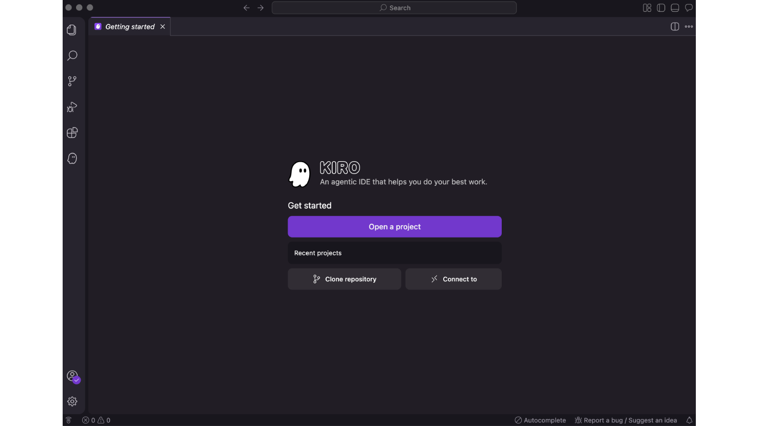 - 在 Kiro 客户端的主界面,点击“Open a project“按钮。