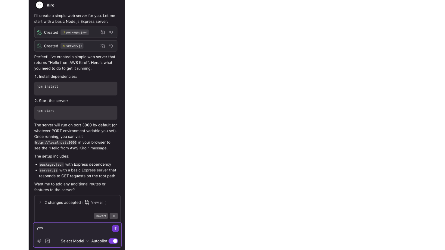 这只是一个开始。接下来,您可以继续与 AI 代理对话,尝试更复杂的指令,比如 “add a new route that returns the current time”,并直接在预览窗口中看到您的应用实时更新,去探索 AWS Kiro 在本地开发方面的无限潜力!