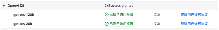 全部打开- 成功为您的 AWS 账户开通 GPT-OSS 模型的使用权限。