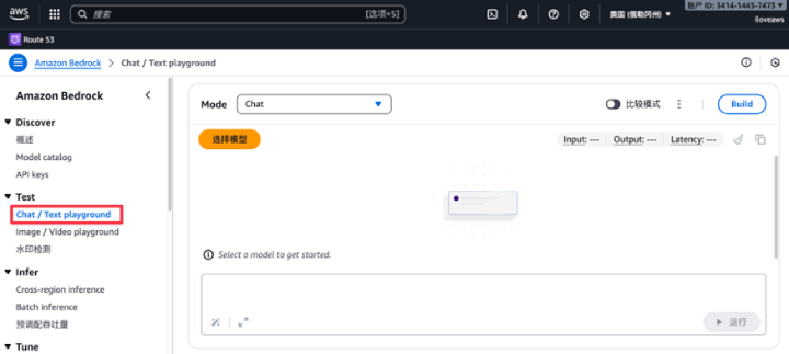 全部打开在 Bedrock 控制台的左侧导航栏,展开“Test”,点击“Chat/Text playground”。
