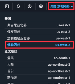 操作方法:点击控制台右上角的区域下拉菜单,从列表中选择“美国 俄勒冈州 us-west-2”。