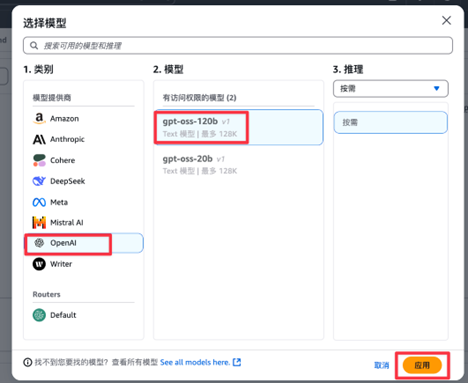 在弹出的窗口中,选择 OpenAI (提供商),然后选择 gpt-oss-120b 作为模型。点击“应用 (Apply)”。