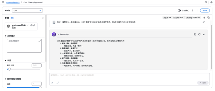 - 熟练使用 Amazon Bedrock 的聊天交互平台 (Chat Playground)。