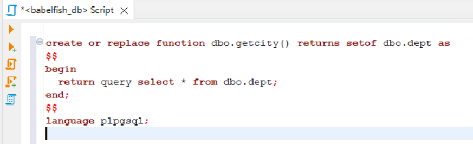 create or replace function dbo.getcity() returns setof dbo.dept as $$ begin return query select * from dbo.dept; end; $$ language plpgsql;