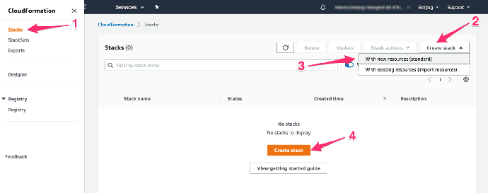 - 进入 CloudFormation 主页,在左侧菜单点击“Stacks”,在出现的页面中点击“Create stack”并选择“With new resources(standard)”,再点击页面中间的“Create stack”按钮