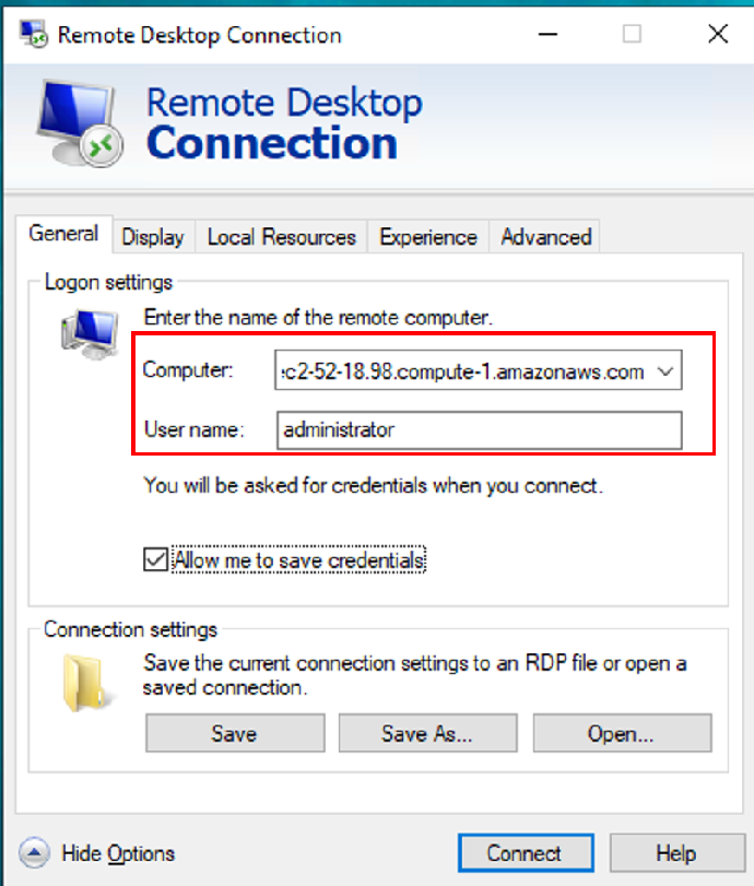- 如使用Windows操作系统的话,打开远程桌面程序连接EC2实例(通常在Windows运行对话框中输入 mstsc 即可打开),如使用MacOS系统的话,安装微软远程桌面工具并连接EC2实例