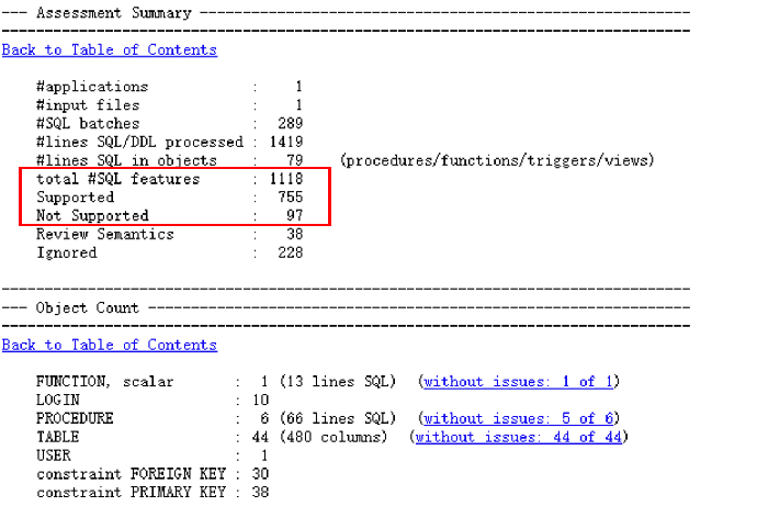 - 先查看Assessment Summary(评估总结)和Object Count(对象统计)这一段显示总体情况:DDL 行数,支持和不支持的特性数量等信息,以及根据对象所列出的支持和不支持的特性数量