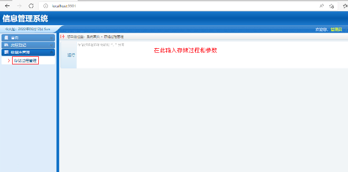 1. 在远程桌面上打开 Edge 浏览器,输入 http://localhost:9901,登陆 Web 应用登陆后在 Web 应用的左侧选择“数据库管理”→“存储过程管理” 菜单