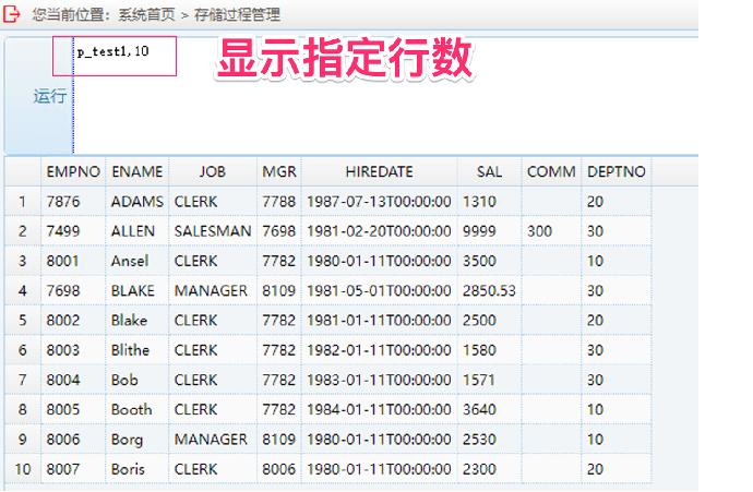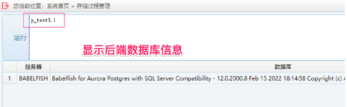 2. 在运行框中输入存储过程名,参数,然后点击“运行”,运行改写兼容性测试:输入 p_test1, 整数参数值,指定显示的行数