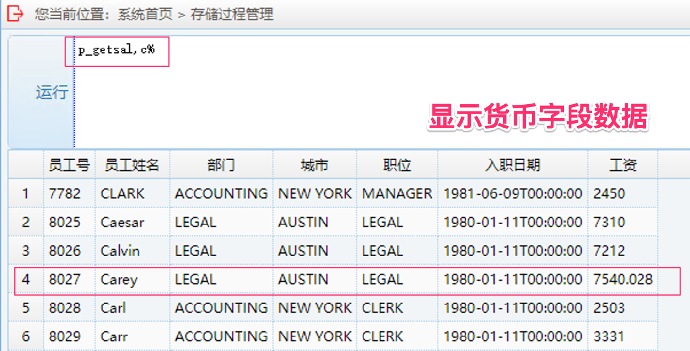 5. 运行 money 字段兼容性测试:输入 p_getsal, 字符加 % 为参数