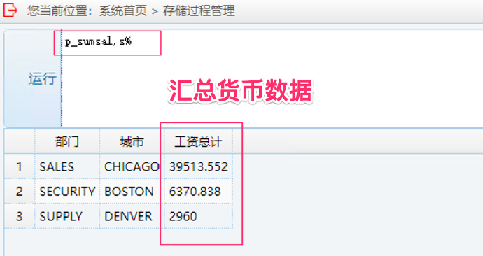 6. 运行 money 字段函数操作兼容性测试:输入 p_sumsal, 任意字符加 %