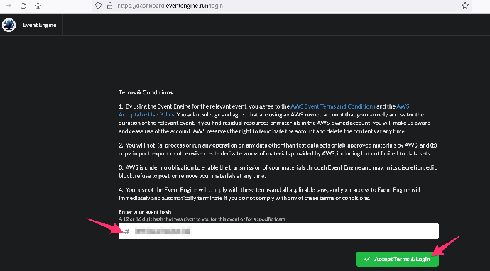 登陆 https://dashboard.eventengine.run/login,输入主持者发送的 Hash 号码,并点击下方的“Accept Terms & Login”