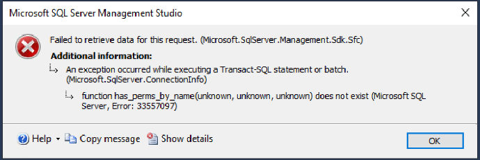 - 注意:登陆后点击数据库时会出现以下错误,此为 Babelfish 和 SSMS 的兼容性问题,点击 ok 忽略错误即可。
