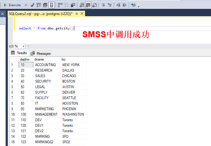 - 调用在 PostgreSQL 中创建的自定义函数 getcity(),显示执行成功 select * from dbo.getcity()