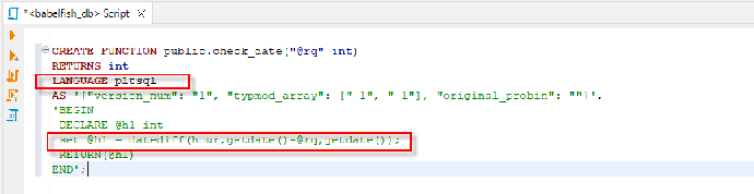CREATE FUNCTION public.check_date("@rq" int) RETURNS int LANGUAGE pltsql AS '{"version_num": "1", "typmod_array": ["-1", "-1"], "original_probin": ""}', 'BEGIN DECLARE @h1 int set @h1 = datediff(hour,getdate()-@rq,getdate()); RETURN(@h1) END';