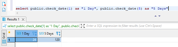 - select public.check_date(1) as "1 Day", public.check_date(5) as "5 Days"