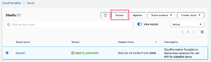 1. 在 CloudFormation 控制台的堆栈页面中,选择要删除的堆栈。该堆栈当前必须处于运行状态。在堆栈详细信息窗格中,选择 Delete (删除)