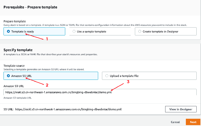 - 选择模版来源于“Amazon S3 URL”,输入 S3 中的地址:https://xiekl.s3.cn-northwest-1.amazonaws.com.cn/bingbing-dbwebniar/demo.yml 并点击下一步