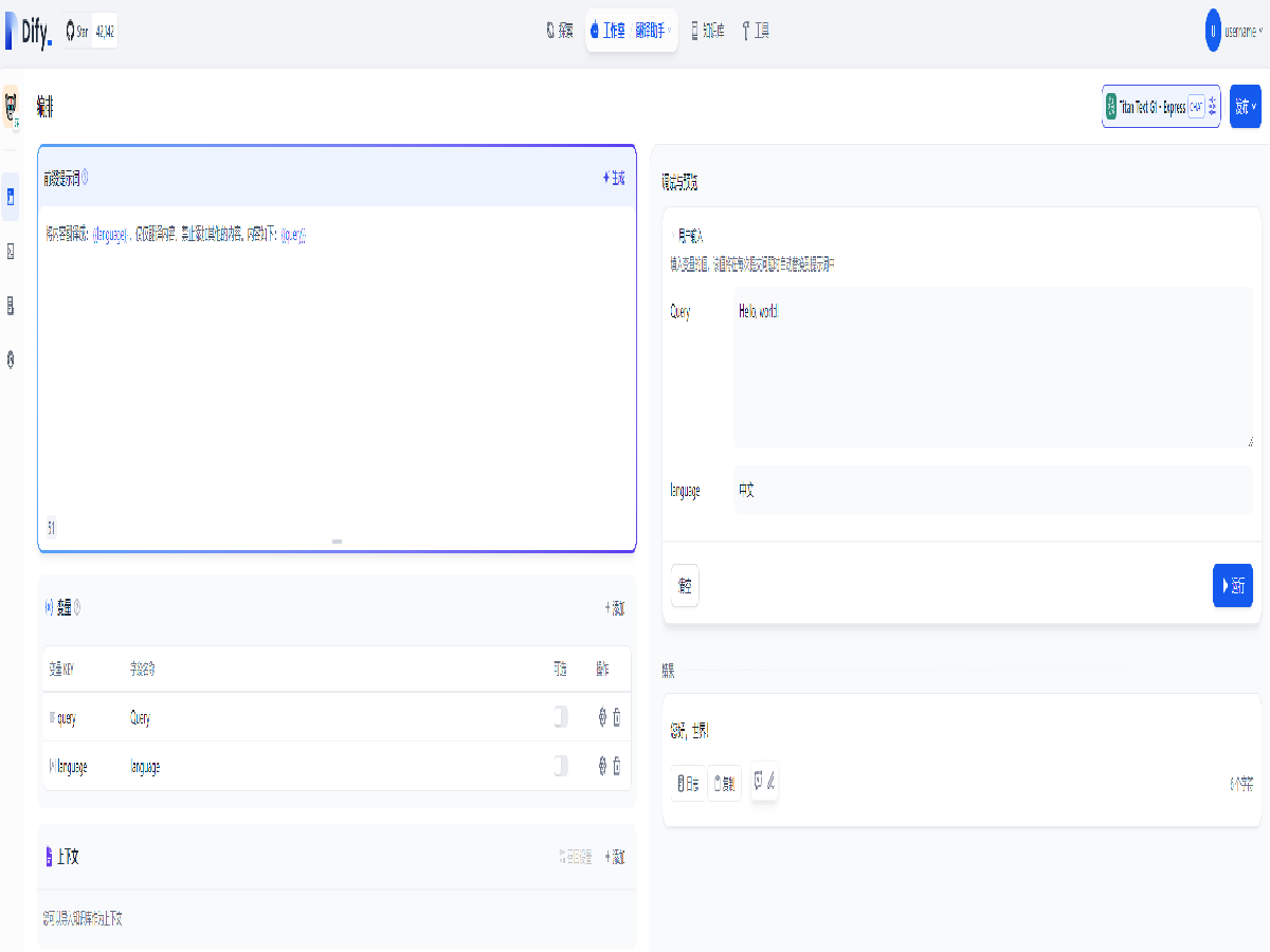 Dify 还可以利用大语言模型进行复杂的翻译,教程中展示了简单的单语种翻译场景,利用多个不同的变量,还可以进行更复杂的翻译需求。