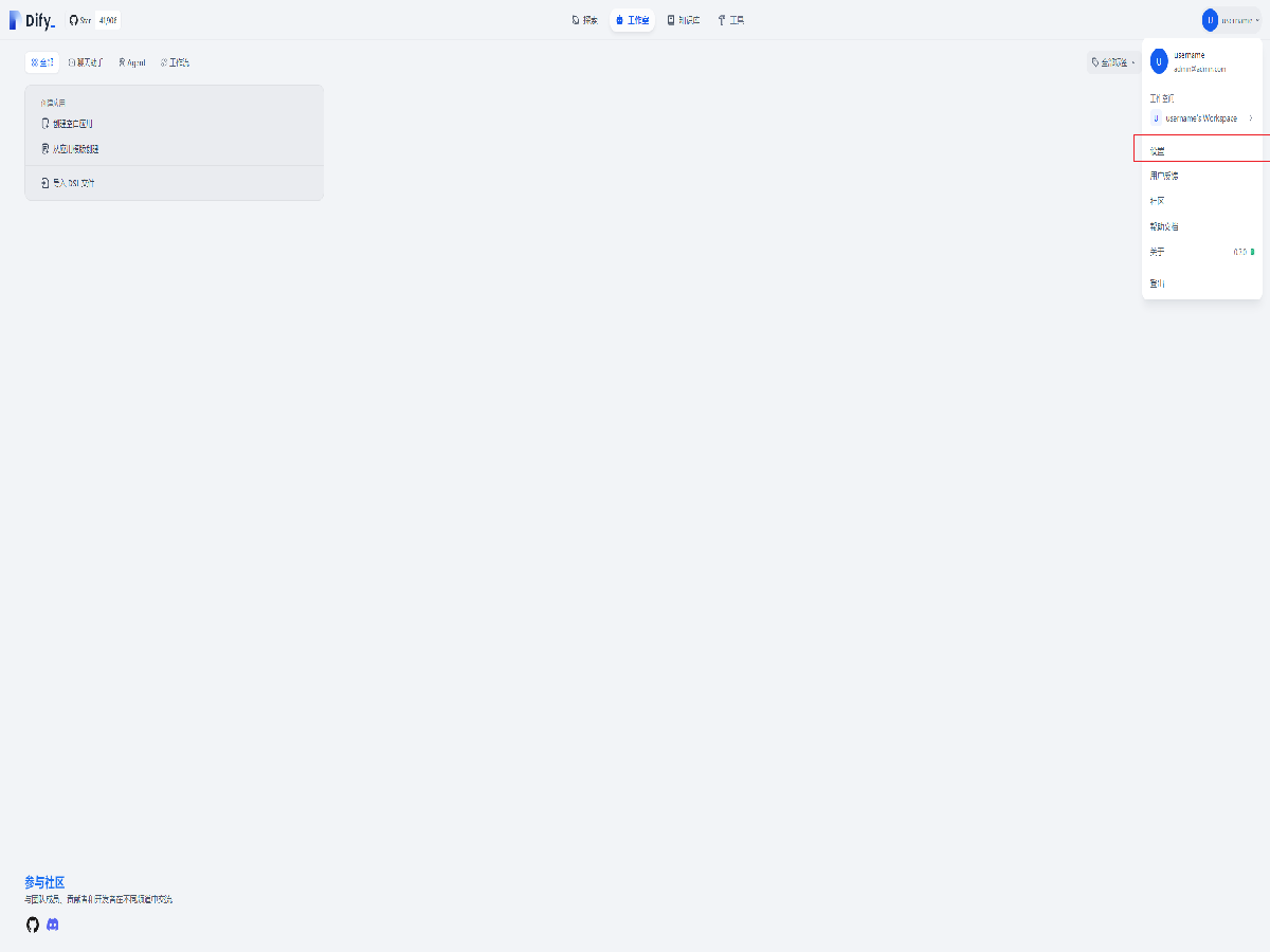 设置好管理员账号的邮箱,用户名和密码后,在登录界面输入邮箱及密码即可进入 Dify 默认界面。