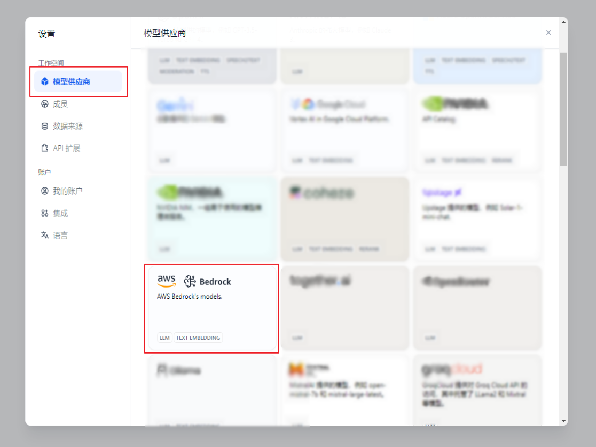 在左侧栏目中找到 模型供应商,并选择 Bedrock。