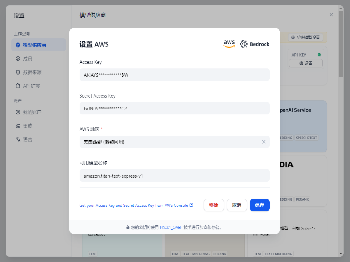 输入 Access Key / Secret Access Key,选择相应的 AWS Region,在可用模型名称中输入 amazon.titan-text-express-v1,点击保存,若返回模型选择页面则保存成功。