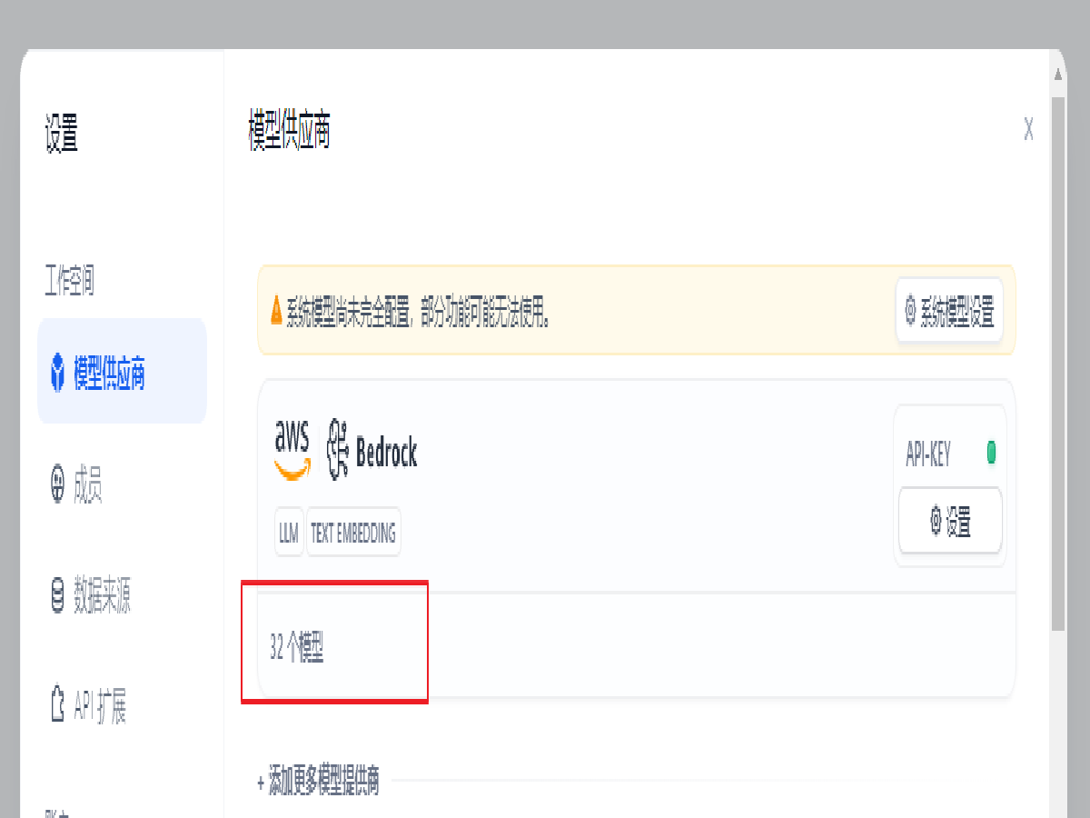 验证模型权限,点击 Bedrock 下方的 32 个模型(数量依据实际情况会有变化),即可展开全部以获取访问权限的模型列表。