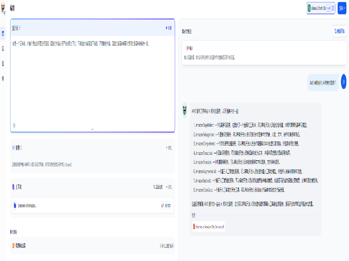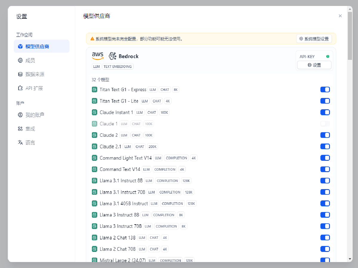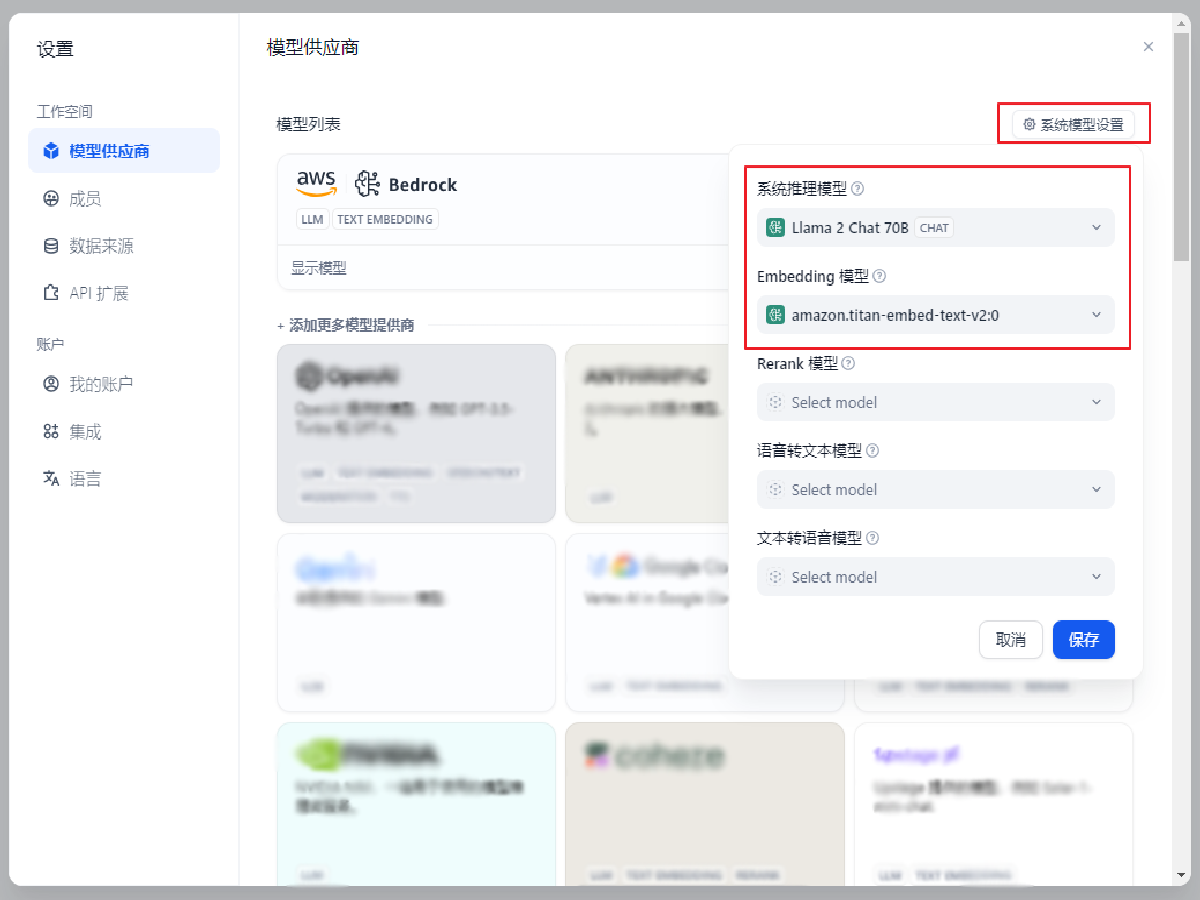 点击右上角的 系统模型设置,选择默认系统推理模型为 Llama 2 Chat 70B, Embedding 模型为 amazon.titan-embed-text-v2:0