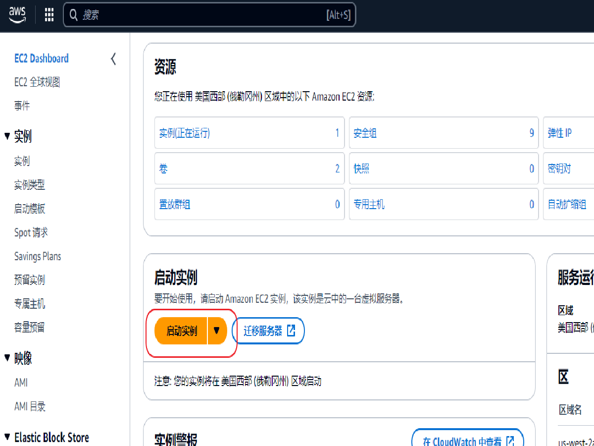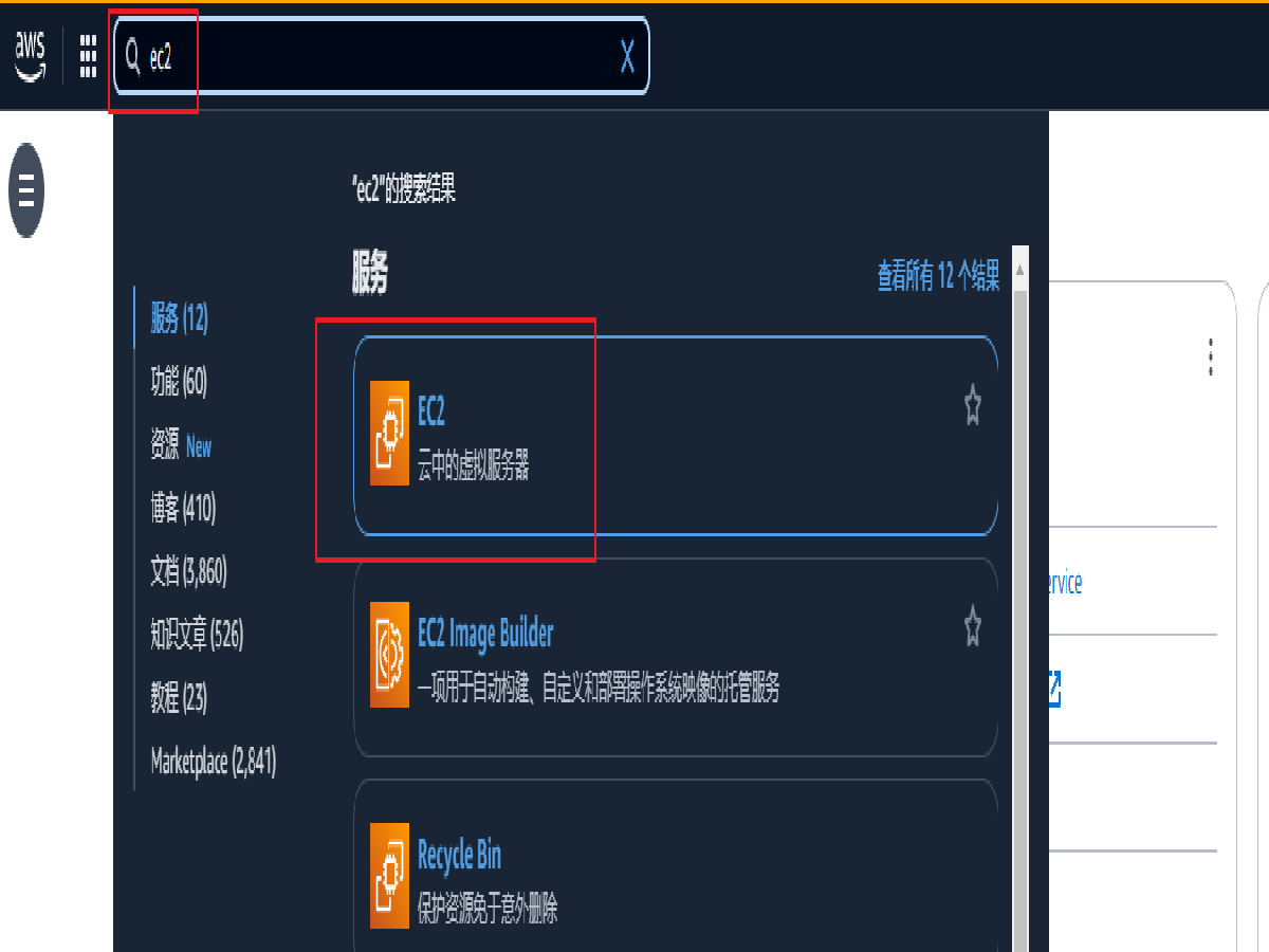登录进入 AWS 控制台,在上方搜索框输入 EC2,然后点击搜索结果中的 EC2 进入 Amazon EC2 控制台。