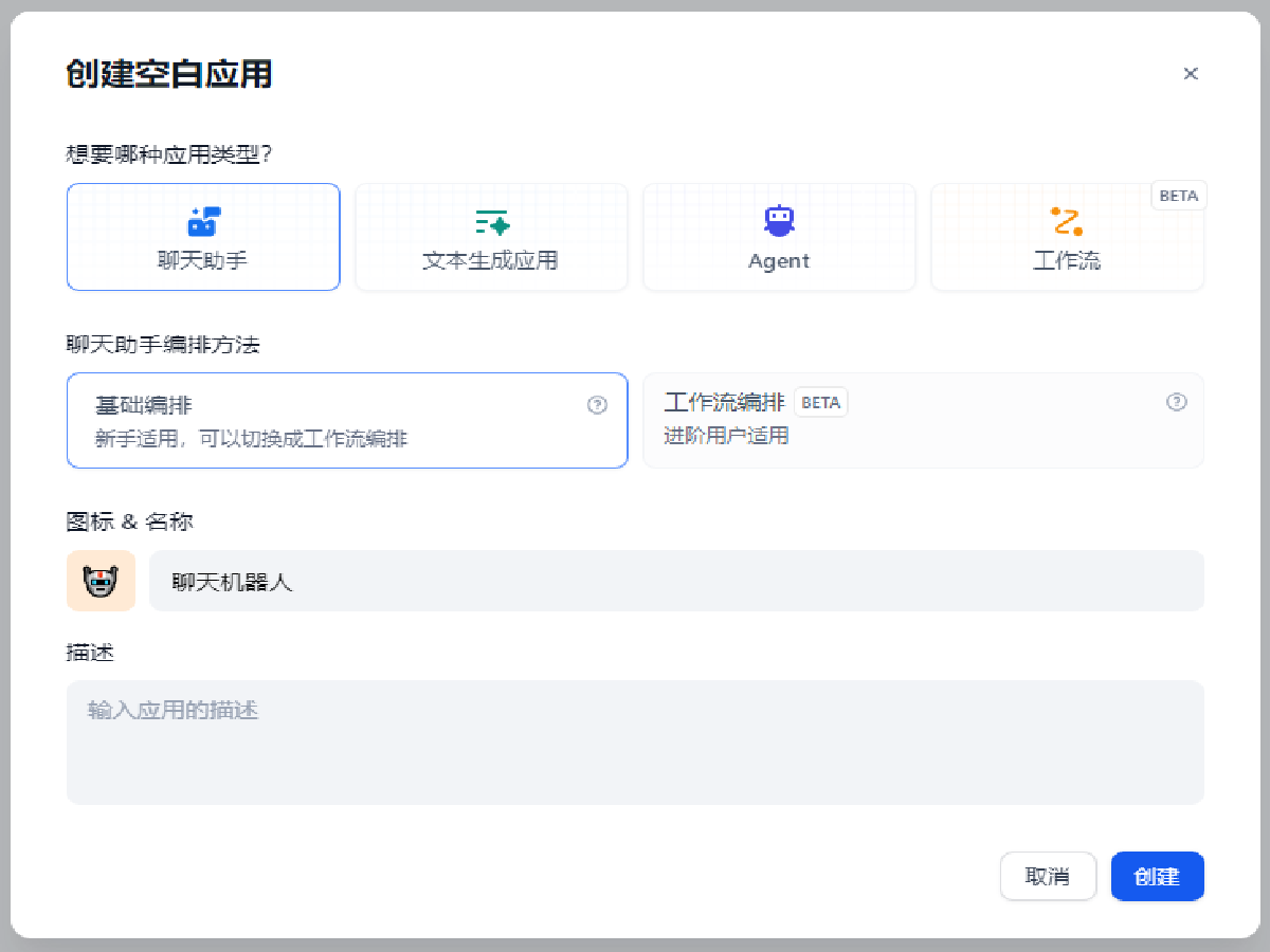 选择聊天助手,基础编排,并为此应用起名,图中应用名称为聊天机器人,点击创建
