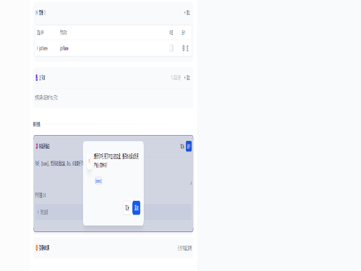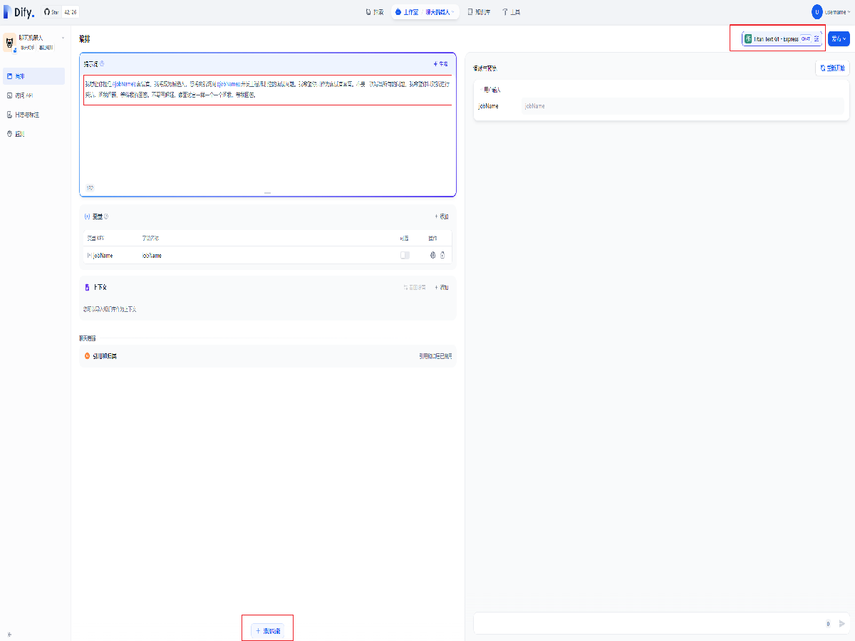 在编排页面中,添加提示词如下,并确认添加变量 jobName