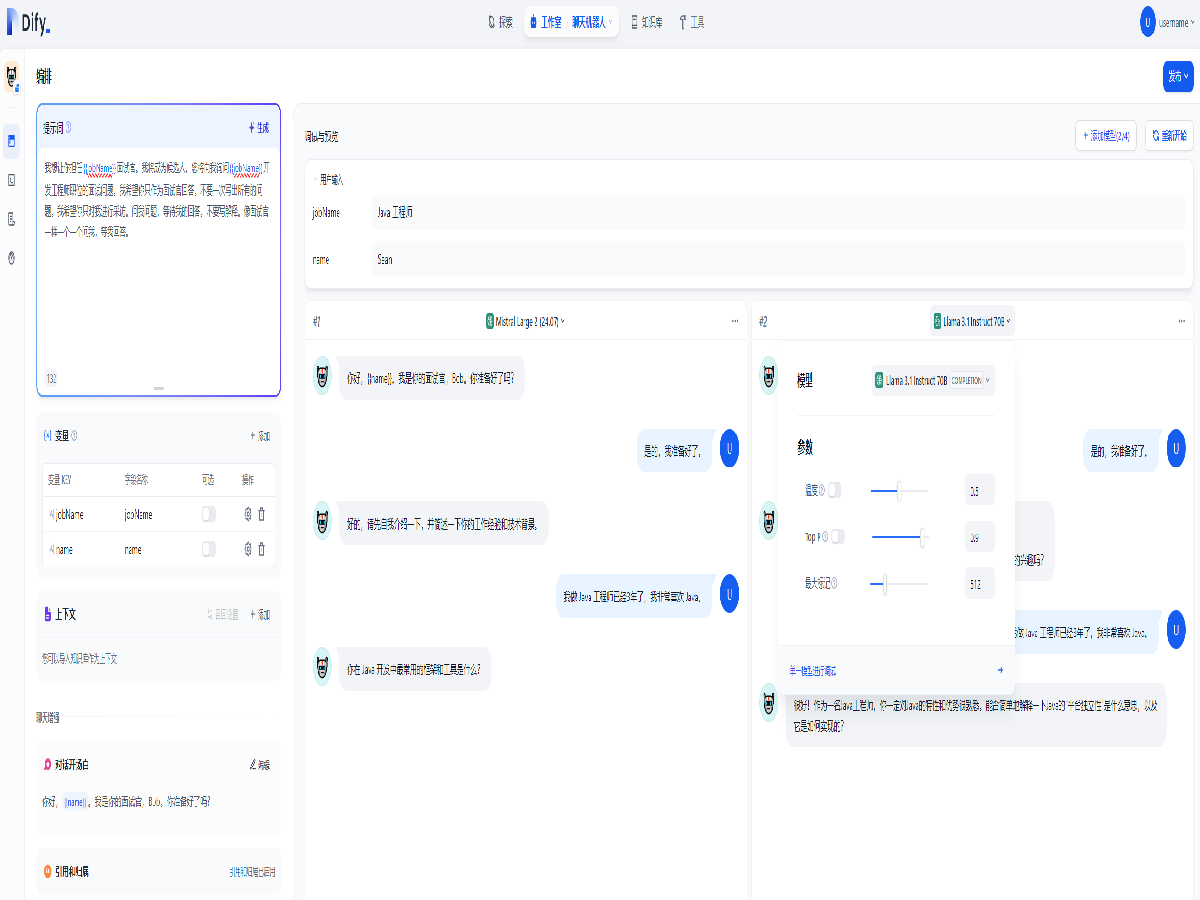 通过 Dify 部署一个用于模拟面试的对话型应用,进行模拟面试,还可以切换模型,开启模型对比,以及微调模型参数,以便模拟不同的面试过程。