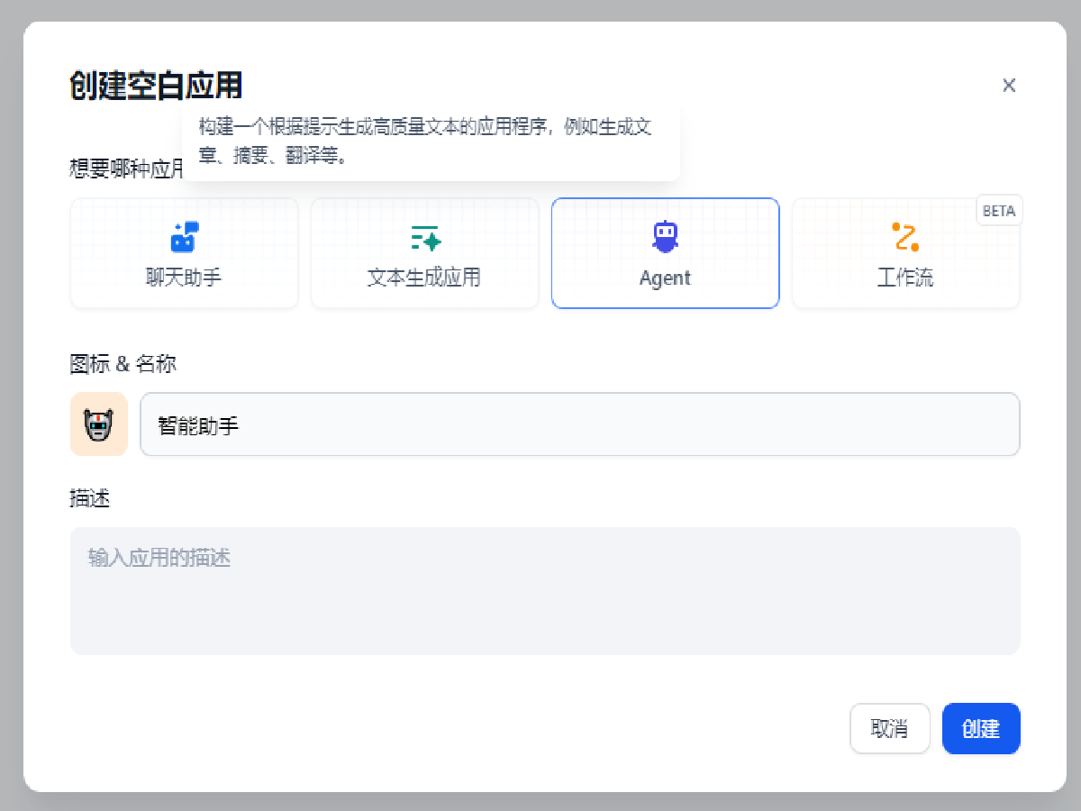 选择 Agent,并为其命名,图中应用名称为智能助手,点击创建。