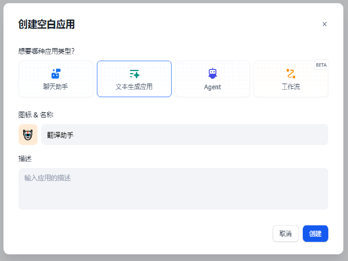 选择文本生成应用,将其命名为翻译助手。