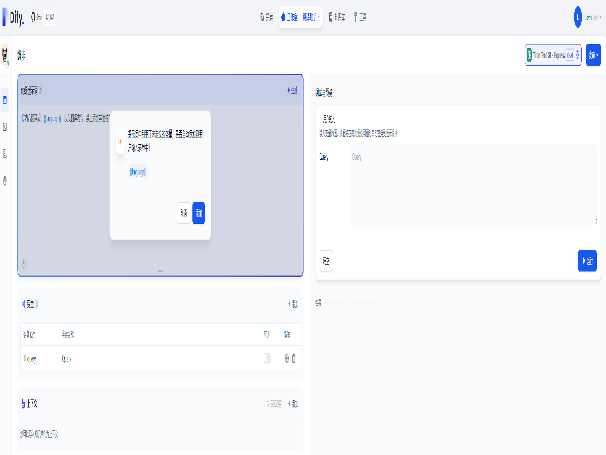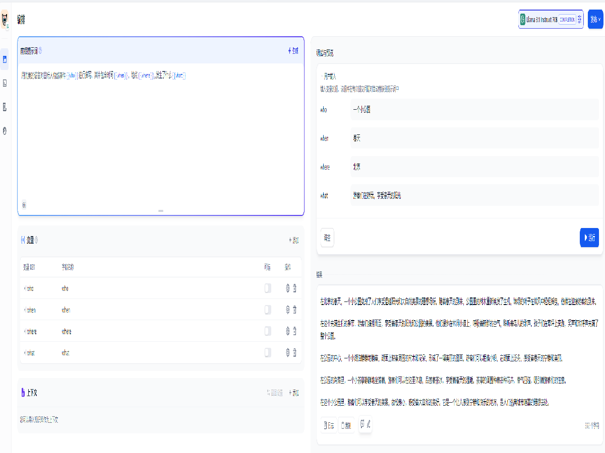 Dify 还可以利用大语言模型进行文字创作,利用多个变量和上下文,可以实现多场景的快速创作,添加提示词如下,并确认自动添加变量: