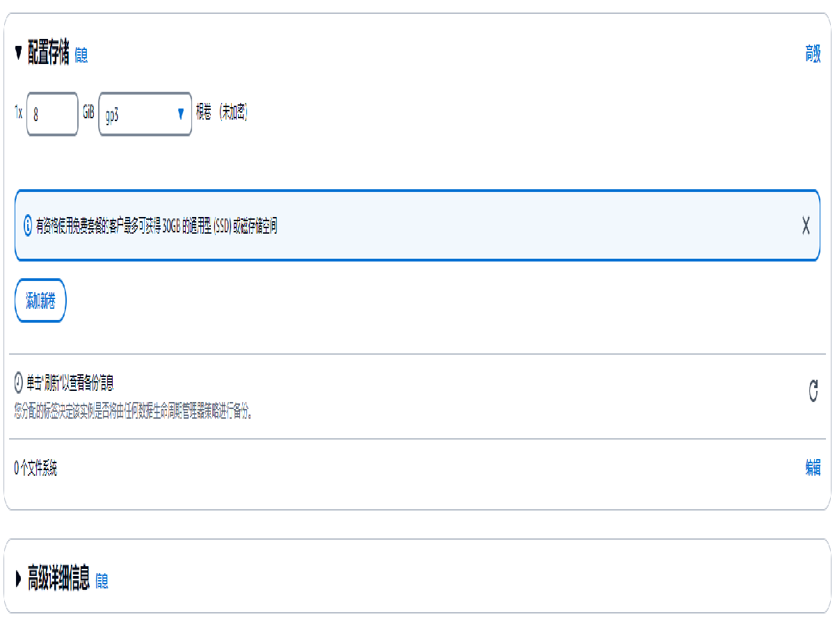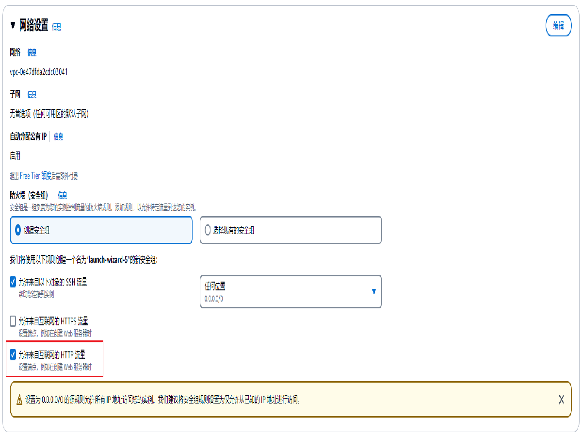 网络设置:默认选择 创建安全组,默认勾选 允许来自以下对象的 SSH 流量,来源为 任何位置 0.0.0.0/0,勾选 允许来自互联网的 HTTP 流量